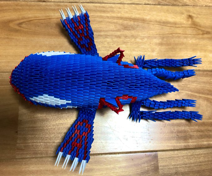 以前 折り図は載せないと書きましたが 需要があるようなので 折り直してみました ですが それでも難しめです 『 グラードン ver2 』 (折り方は こちら ) 使用枚数は 頭~尻尾が 1:2の長方形1枚ずつ 手足が 正方形1枚 計2枚 上から見ると こんな感じ ポケモンシリーズより 『 カイオーガ 』 の折り方です関連作品:グラードンの折り方 / レックウザの折り方もし説明が分かりづらかったら 文字は無視して写真を見ポケモンたち ゲンシカイオーガ 全身にみなぎるエネルギーが海水と化して、体から湧き出している。 肉体は海水に近い状態で、青い皮膚はサファイアのような質感で輝く。 身体が半透明となり、体内から黄色い光を放つ。 より神秘的で壮麗な姿となっ